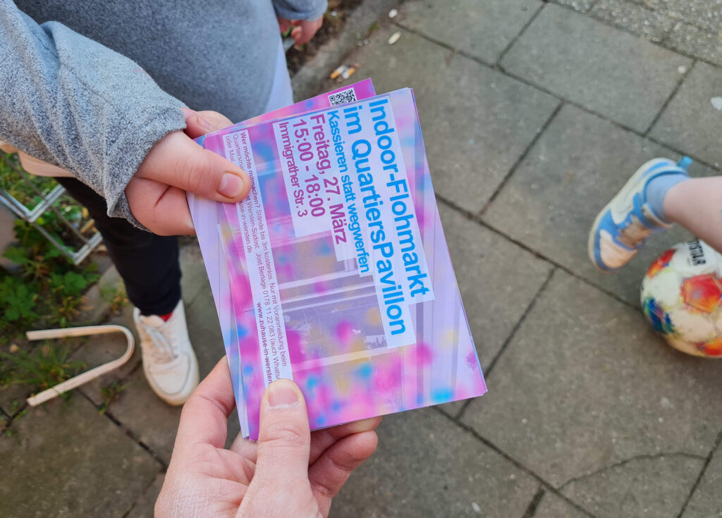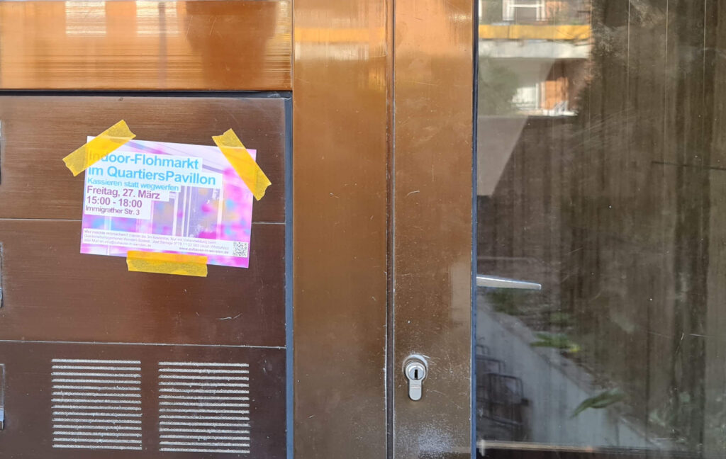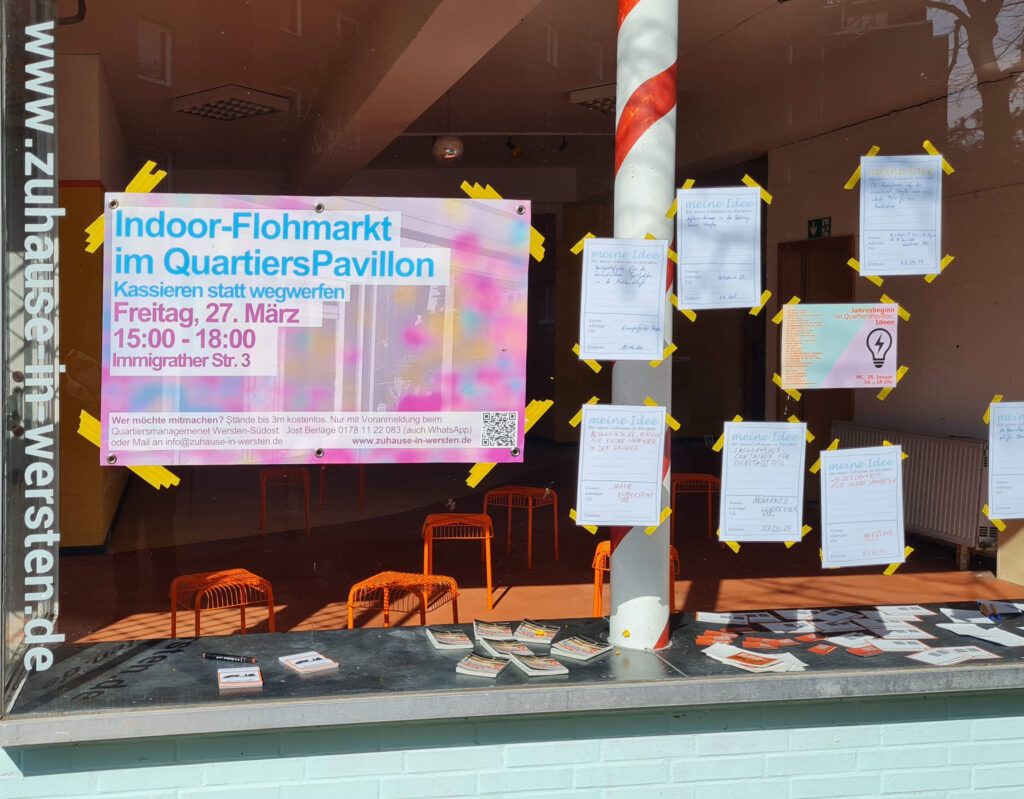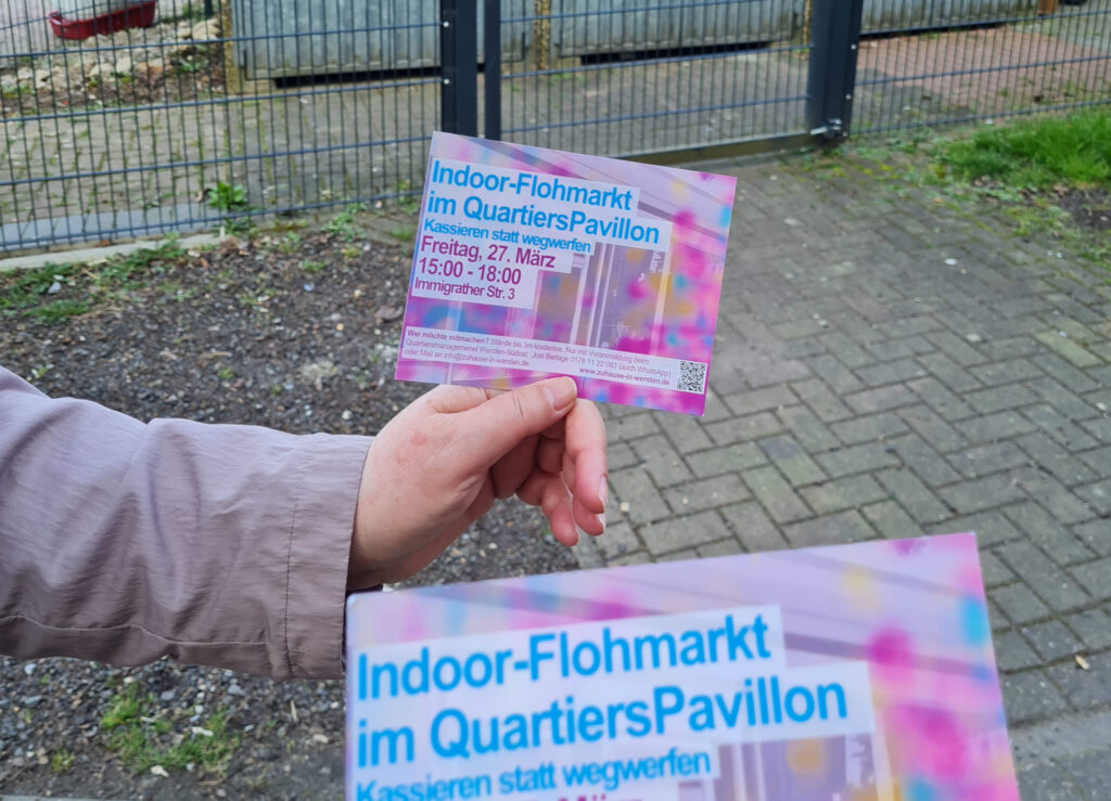 Mit dem QuartiersPavillon eröffnen sich neue Möglichkeiten im Quartier. Daher organisieren wir den ersten Flohmarkt diesen Jahres schon jetzt – denn in der Immigrather Str. 3 können NachbarInnen auch bei schlechterem Wetter kaufen und verkaufen. So lassen sich Ressourcen schonen und Müll vermeiden, während die Kasse klingelt!