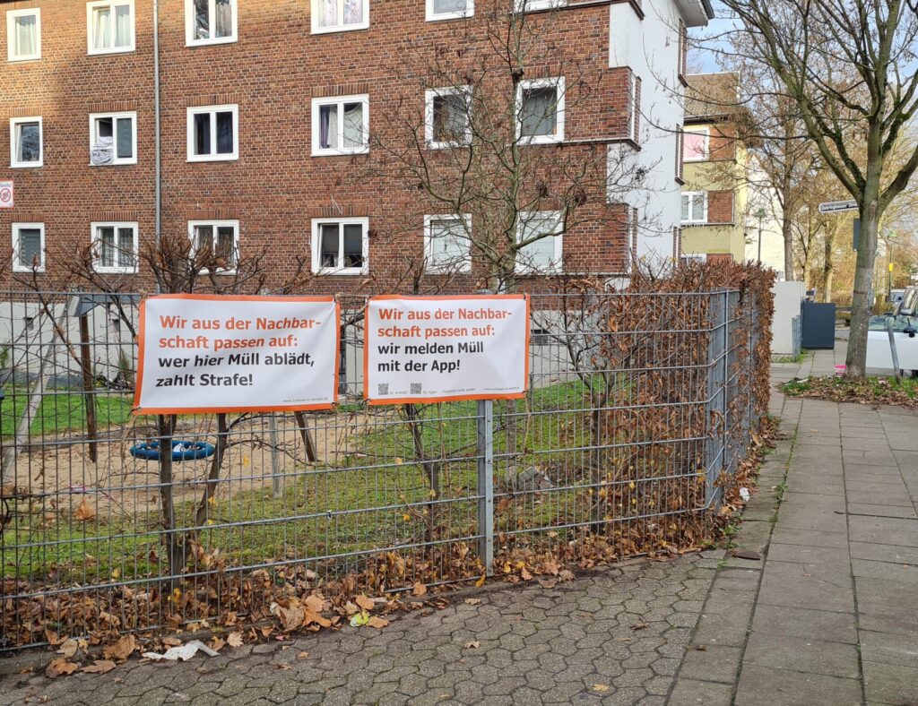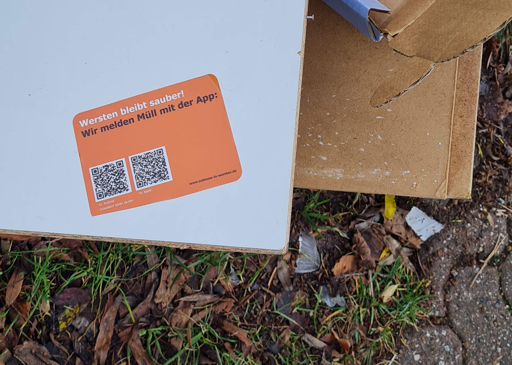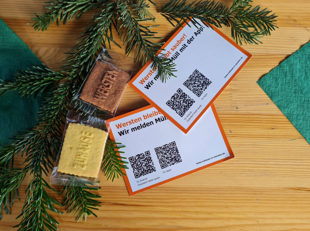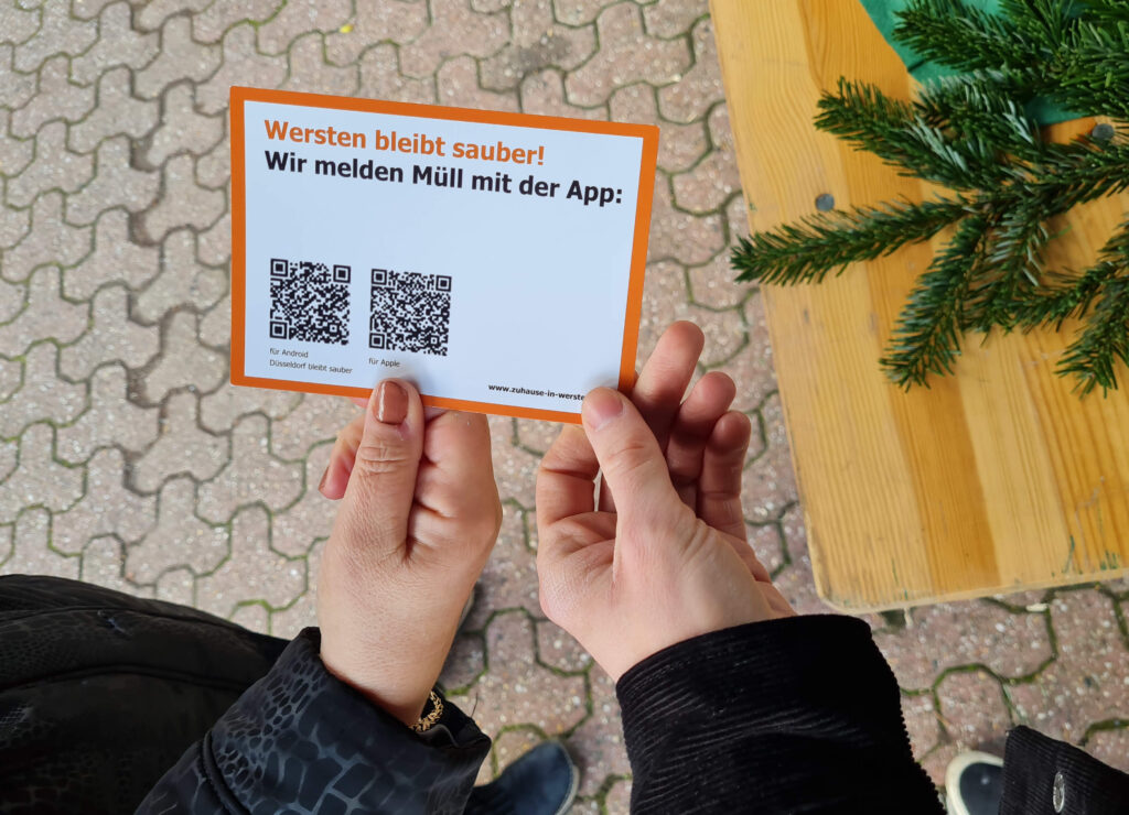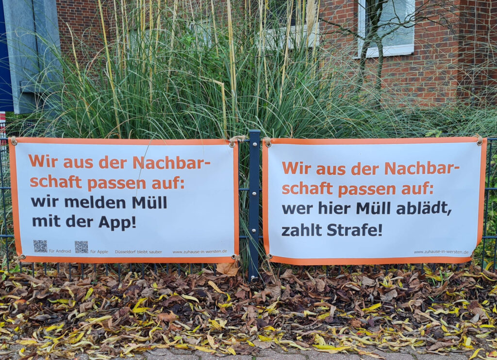 Mit ihnen machen wir nicht nur auf das Thema ‚Müll‘ aufmerksam, sondern liefern mit dem Hinweis auf die ‚Düsseldorf-bleibt-sauber-App‘ direkt einen Weg, sich ohne großen Aufwand selber für mehr Sauberkeit im Quartier einzusetzen: App herunterlagen, Foto und Standort übermitteln.